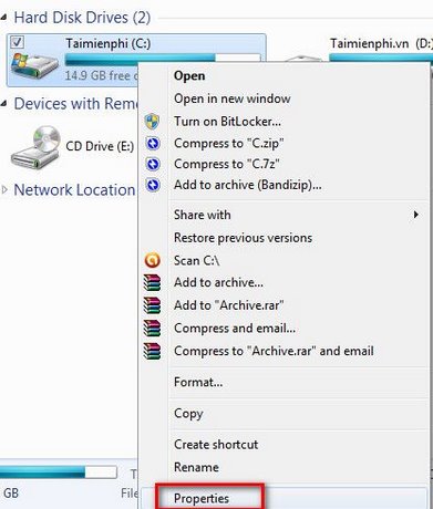 Phải chuột vào ổ đĩa C và chọn Properties